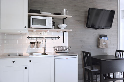 Mini kitchen with two hotplates, refrigerator, kitchen fan, microwave, kettle, French press, toaster and basic kitchen equipment and kitchen furniture.